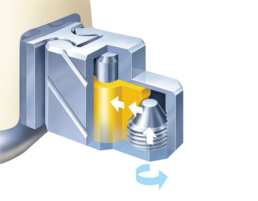 The Servo SD-attachments are vernier adjustable, extra coronal retaining elements. The SD-attachment LV is a longer version of the classic SD-attchment and has integrated guidance in the housing, corresponding to the grooves in the male. The height of the SD-LV can be individually adjusted, depending on the situation. In both cases friction is achieved through vernier adjustment of the acrylic female sliding over the male. The male is of burn out acrylic and the housing and activating screw are both made of titanium. The housing can either be lasered or bonded with adhesives into the prosthetics.